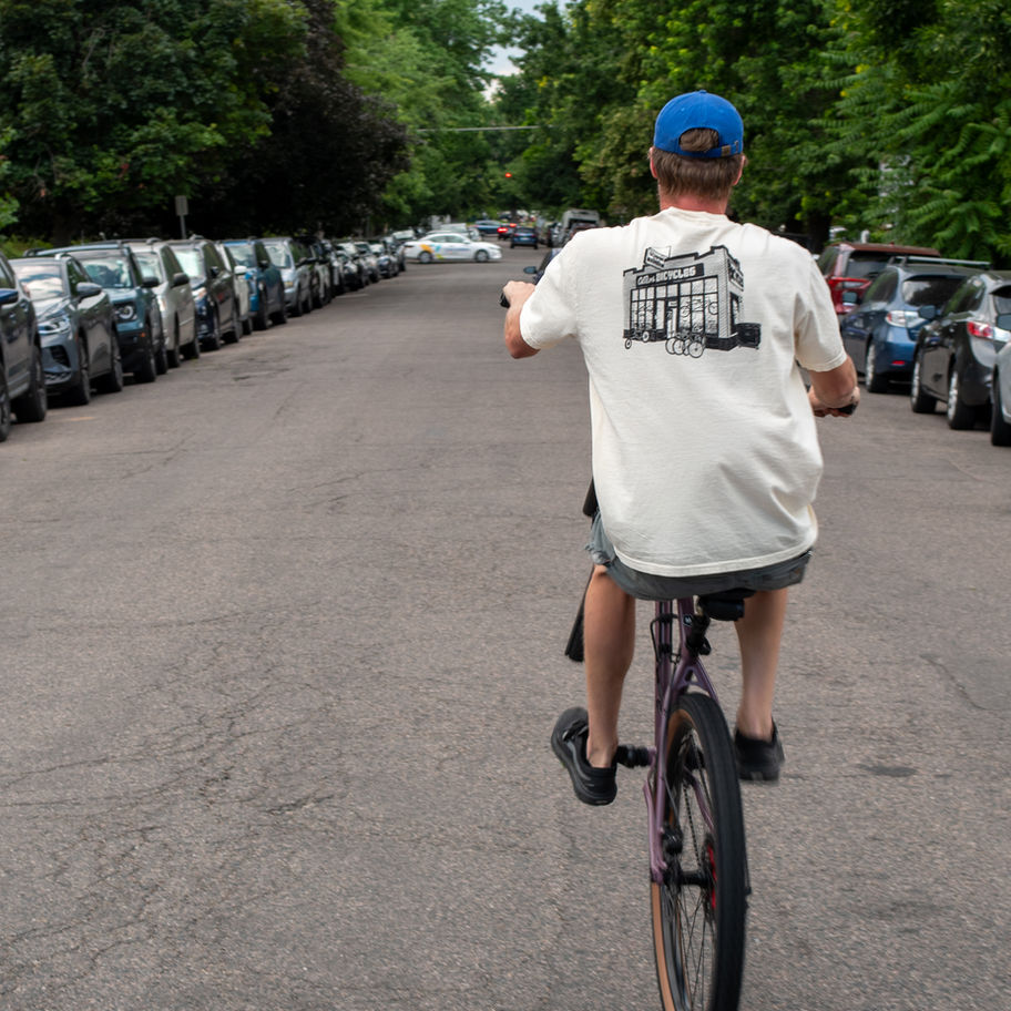 Our current shop shirt here at Z Cycle. Designed by one of the owners Andrew Richmond, this design pays homage to the space we occupy, which has been a bike shop for over 90 years.